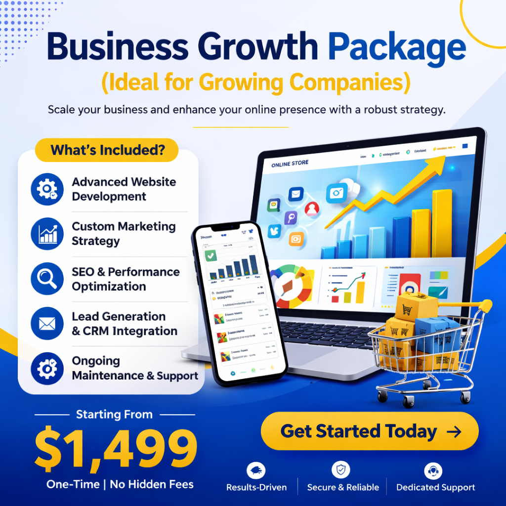 A powerful package designed for growing companies looking to expand their reach, generate more leads, and increase sales. This package includes advanced marketing strategies, performance optimization, social media management, targeted advertising, and business scaling support. Ideal for businesses ready to take the next step toward sustainable growth and long-term success.